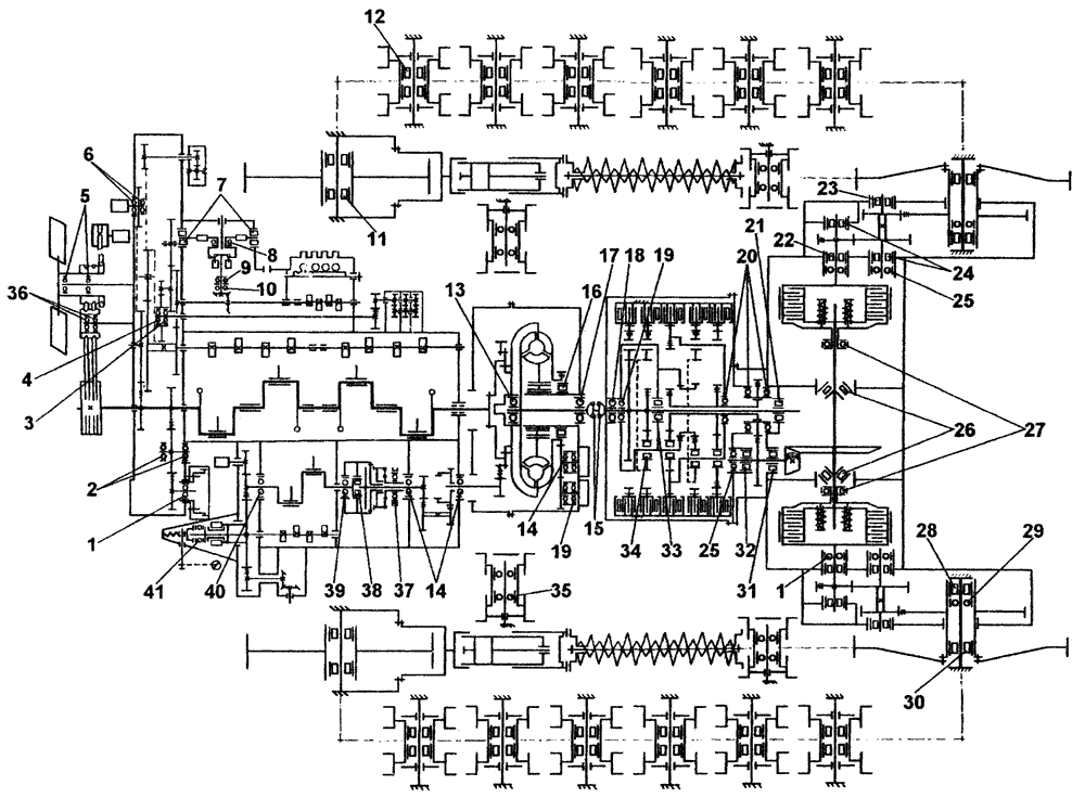 Схема расположения подшипников на тракторе Т10М с гидромеханической трансмиссией