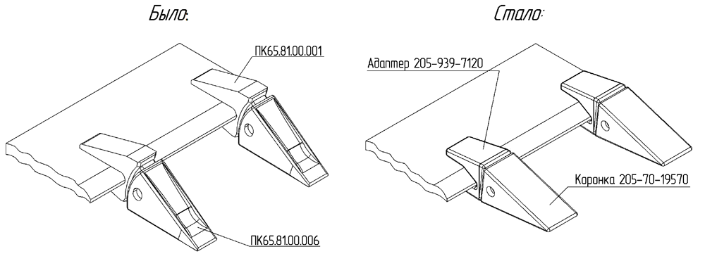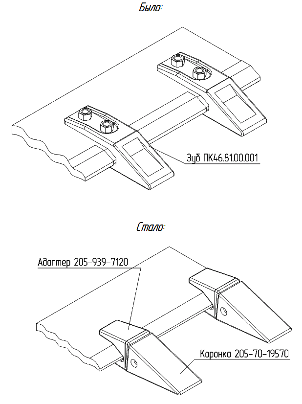 Для повышения износостойкости рабочего элемента и удобства замены в эксплуатации Зуб ПК46.81.00.001 заменен на коронку 205-70-19570 с адаптером 205-939-7120.