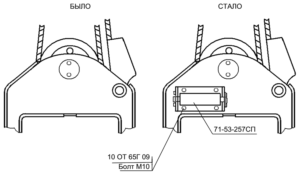 Для устранения задевания троса о корпус лебедки трубоукладчика ТР12 введен ролик 71-53-257СП (аналогично тому, как на ТР20). Ролик крепится к корпусу лебедки четырьмя болтами М10-6gx25.58.019 с шайбами 10 ОТ 65Г 09.
