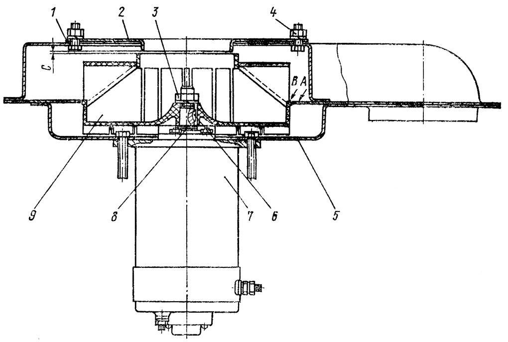 6. Выступание торца В крыльчатки относительно поверхности А перегородки должно быть не более 1 мм, зазор С должен быть в пределах 1...2 мм.