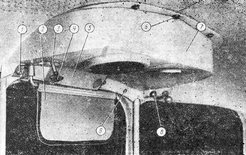 Подсоедините провод к клемме электродвигателя вентилятора. Установите, закрепите обшивку крыши и плафон освещения кабины. Установите кожух 5 ( см. рис. 309) электродвигателя стеклоочистителя и закрепите двумя болтами с шайбами и проводом массы,- расположив его наконечник между болтом и шайбой. Соберите кожух 14 ( см. рис. 308 ) с воздухораспределителем 17 и зажимом 15 и закрепите болтом 16. с двумя гайками и шайбой. Уложите уплотнение 18 на крышку кожуха теплообменника и установите кожух, с воздухораспределителем 7 (см. рис. 309), выведя тягу 3 через отверстие кожуха с воздухораспределителем. Закрепите кожух с воздухораспределителем тремя болтами 6 с шайбами плоскими и двумя шурупами- 9 с шайбами. Установите светозащитный козырек 2, закрепив его двумя гайками 1 с пружинными шайбами. Установите опору зеркала с кронштейном и закрепив ее болтом 8 с шайбой. Наверните на тягу 3 включения теплообменника рукоятку 4.