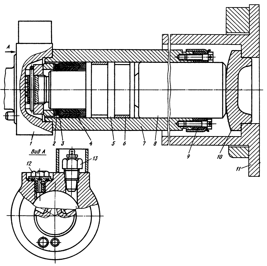 Уплотнение между хвостовиком поршня и зеркалом цилиндра осуществляется пятью шевронными кольцами 4, прижатыми гайкой, навернутой на хвостовик поршня. Изношенные уплотнительные кольца поджимаются пружинным кольцом 3 или изменяют количество регулировочных прокладок 2.