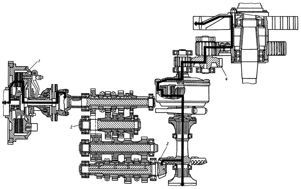 На рис. 58 сплошными линиями указан путь силового потока на III передаче переднего и на IV передаче заднего хода.