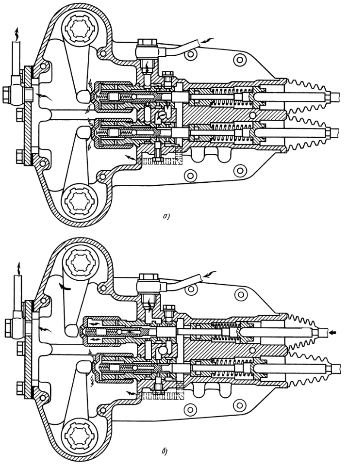 При прокачивании рычага управления, например, влево левая штанга воздействует на левый толкатель, который, выбирая зазоры, перемещает золотник. Во время перемещения золотника перекрывается перепускное отверстие в левой гильзе, и масло через сверление в золотнике поступает к поршню, сжимая перепускной клапан. Поскольку кромка золотника перекрывает слив масла через сверление в корпусе, давление под поршнем растет до тех пор, пока не уравновесится сопротивлением рычага выключения. Перемещаясь под действием давления, поршень поворачивает рычаг выключения, преодолевая усилие пружин муфты поворота, который через вертикальный валик и отводку выключает левую муфту поворота.