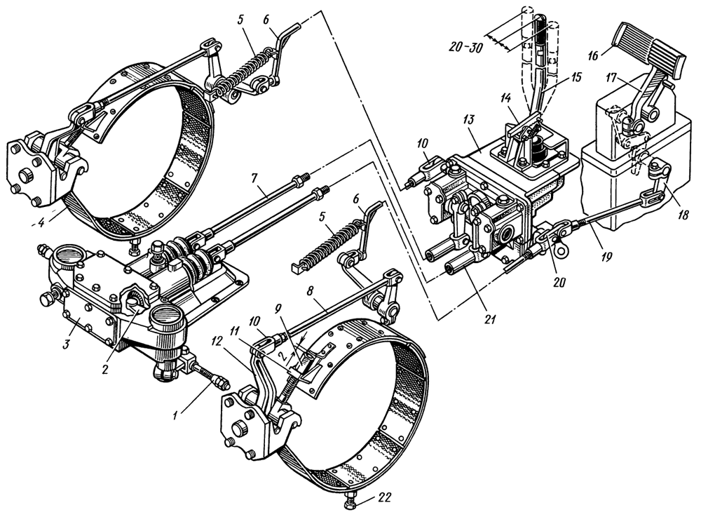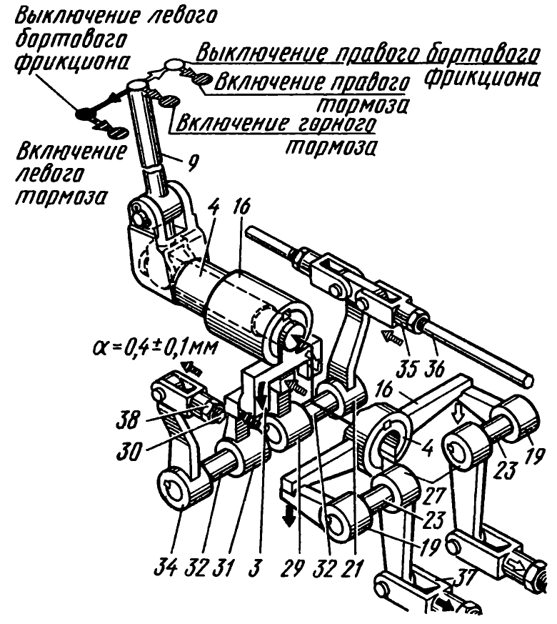 Все рычаги подразделяются на две группы управления: тормозами и сервомеханизмами. Рычаги обеих групп действуют независимо друг от друга. При движении рычага управления 6 вдоль продольной оси трактора работает привод управления тормозами, а поперек — привод управления сервомеханизмом.