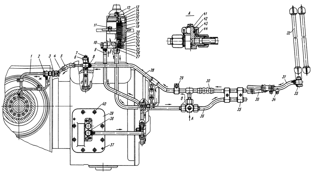В холодное время года радиатор отключают от системы с помощью крана 41 «зима — лето», расположенного на левом лонжероне рамы трактора перед коробкой передач. Когда кран установлен в положение «зима» масло идет к точкам смазывания по малому кругу (стрелка в), минуя радиатор.
