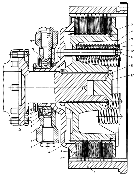 Ведомый барабан вращается на двух шариковых подшипниках с одноразовой смазкой. На ведомом барабане на шлицах расположены два ведомых диска, к каждому из которых прикреплено по шесть фрикционных накладок 24 с каждой стороны.