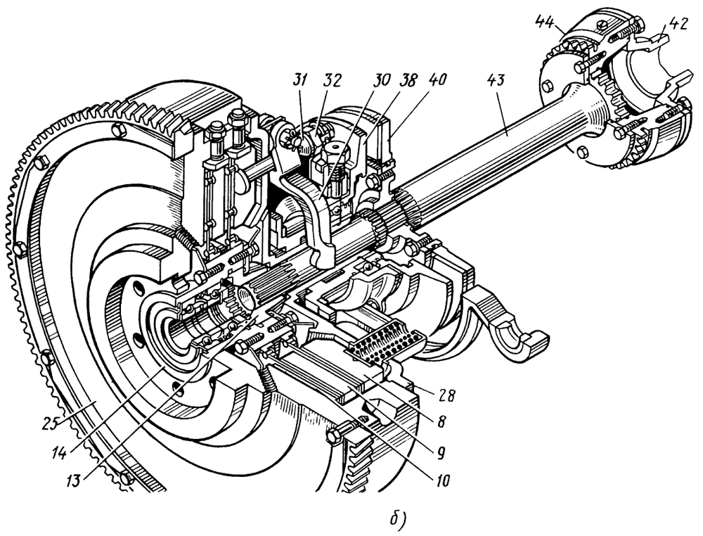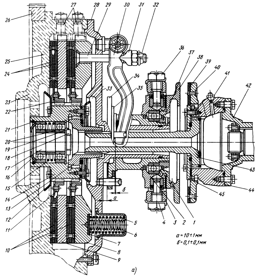 Ведомыми частями сцепления служат два стальных диска 10 с фрикционными накладками 24, расположенными на ведомом барабане 14, зубчатая муфта 13 с карданным валом 43 и стальная проставка 44, которая в свою очередь жестко соединена с верхним валом коробки передач 42.
