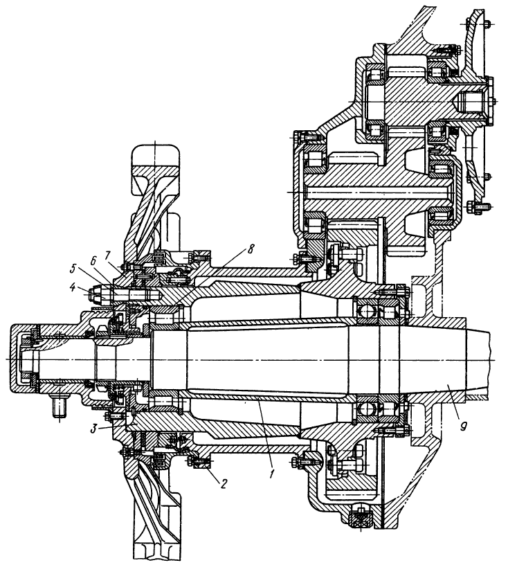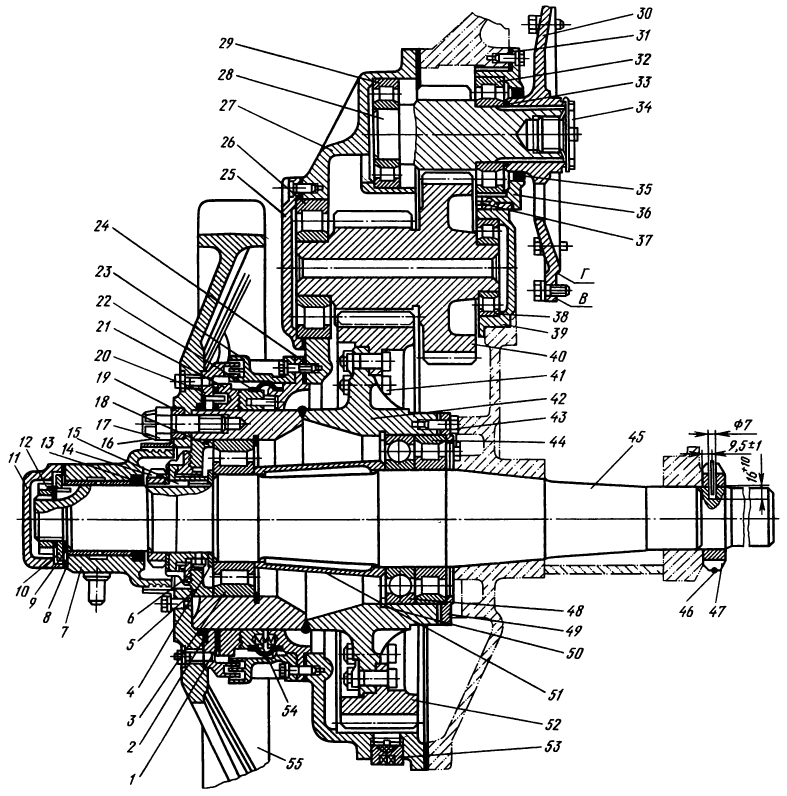 Задний конец ведомого вала выполнен заодно с малой конической шестерней с 13 зубьями, которая находится в постоянном зацеплении с ведомой конической шестерней главной передачи.