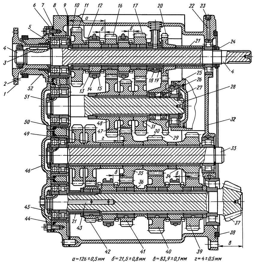 Коробка передач смазывается под давлением (все шестерни, вращающиеся на втулках) и разбрызгиванием. Смазка подводится к ведущему валу через штуцер, хомут 18 и систему каналов, а к выходному валу — через подвод 43.