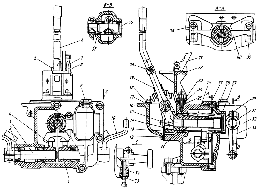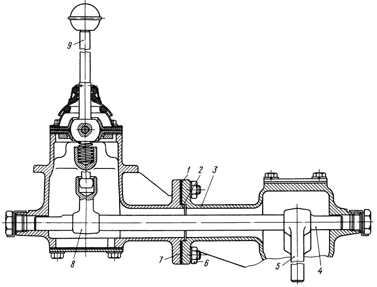 Вилки переключения с поводковыми валиками располагаются попарно в специальных расточках корпуса коробки и накрываются сверху двумя механизмами переключения, которые шпильками и гайками крепятся на двух наклонных площадках корпуса коробки.