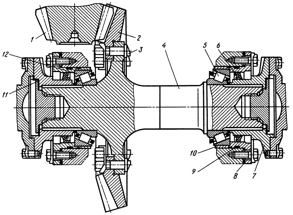После окончания регулировки колеи ставят на место упорную шайбу, заворачивют гайку 12, контрят ее и затягивают болты крепления пяты раскоса гусеничной тележки. Потом устанавливают на место крышку концевого подшипника и затягивают болты.