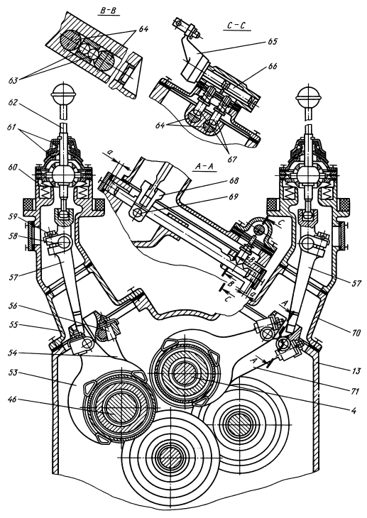 В верхней части промежуточный рычаг имеет цилиндрический колодец, куда входит нижний конец рычагов управления 62. Рычаг имеет в средней части шарообразное утолщение, позволяющее ему перемещаться в шарообразных крышках. Рычаг управления имеет уплотнение 61. В нейтральное положение он возвращается двумя пружинами 60, упирающимися в опорное кольцо.