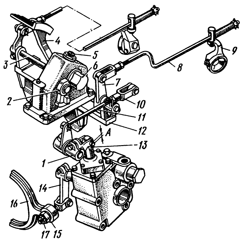 Механическая сборочная единица, управляющая муфтами поворота и тормозами, состоит из однорычажного механизма управления поворотом 13 (рис. 67), педалей управления подачей топлива 16 и правым тормозом 17, правой колонки управления и системы тяг и рычагов.