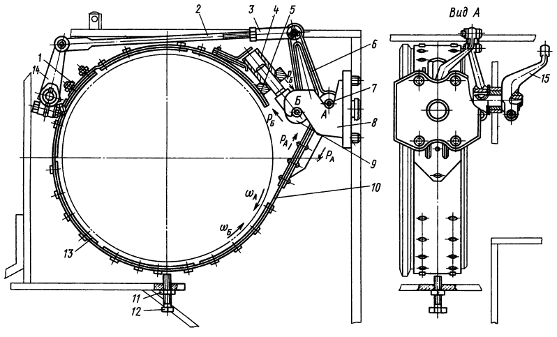Рычаг 6 управления поворотом, установленный на оси в качающемся корпусе 13, может легко перемещаться как в продольном, так и в поперечном направлениях. При движении рычага 6 назад качающийся корпус 13 неподвижен, а нижний конец рычага управления, имеющий паз, охватывает продольный валик 15. На продольном валике 15 расположен ведущий рычаг тормоза, который в зависимости от его углового положения может воздействовать или на правый, или на левый внутренний рычаг тормоза 4. При перемещении верхнего конца рычага управления назад нижний конец передвигает вперед продольный валик с ведущим рычагом тормоза, который, в свою очередь, сдвигает вперед внутренний рычаг, связанный с наружным рычагом тормозной лентой. Включенное положение тормоза может быть зафиксировано защелкой. В случае длительной стоянки необходимо включить защелку горного тормоза. Чтобы снять ее, нужно нажать на хвостовик.