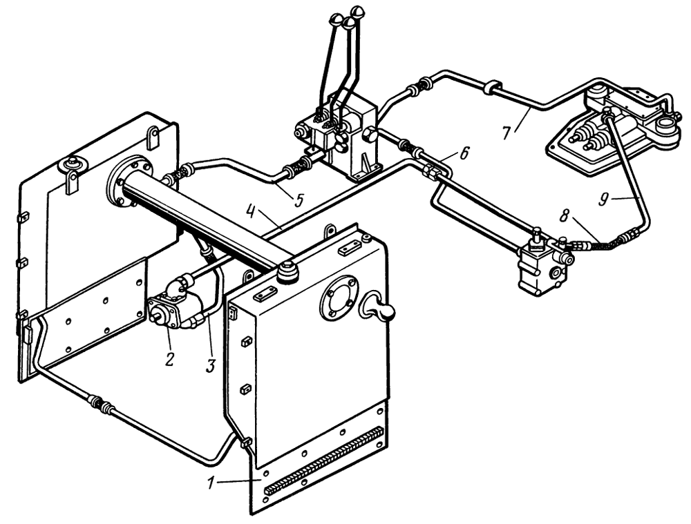 Гидравлическая система управления трансмиссией трактора, оборудованного гидросистемой управления орудиями, состоит из шестеренчатого насоса 2 (рис. 70) левого вращения, установленного справа сзади на крышке распределительных шестерен и получающего от них вращение, и нагнетательных 4, 8, 9 и сливных 5, 6, 7, трубопроводов.