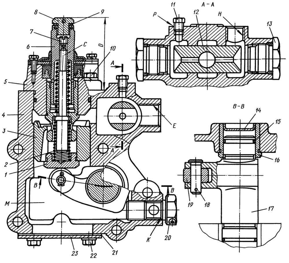 Из полости сервомеханизма масло проходит через систему каналов в полость М, а из нее через трубопровод, который установлен на машине вместо штуцера 20, в масляный бак.