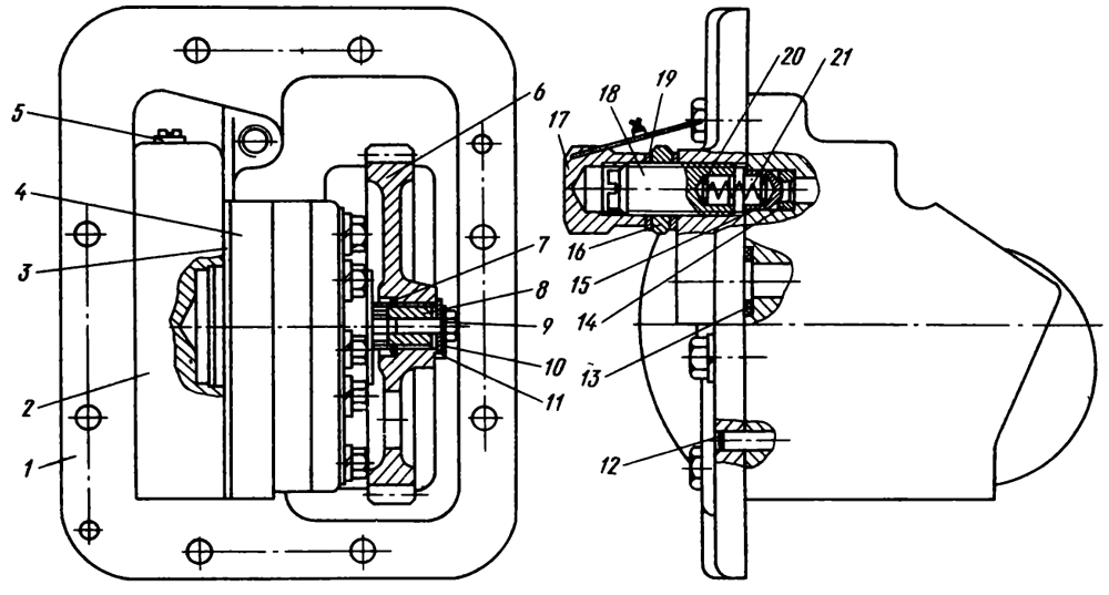 Выключается сцепление следующим образом. Тракторист нажимает на педаль управления, расположенную слева, последняя действует на сервомеханизм, который начинает перемещать стальную отводку 3, и связанный с ней корпус 2 радиального шарикоподшипника назад.