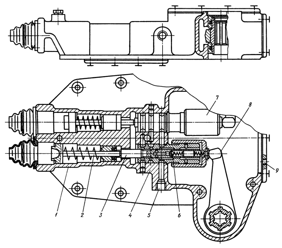 Гидравлический сервомеханизм сцепления прикреплен слева к верхней половине кожуха сцепления и представляет собой легкосъемный узел, состоящий из чугунного корпуса 4, в котором смонтированы управляющие и исполнительные звенья и рычажная передаточная система.