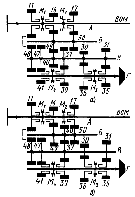 Ведущий 4 и первый промежуточный 28 валы позволяют получать три диапазона скоростей: нормальный, ускоренный и задний ход, а второй промежуточный и ведомый валы — четыре передачи в каждом диапазоне.